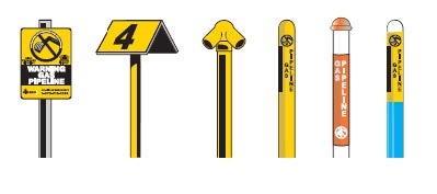 Pipeline markers vary in shape, color and size. The information on these vertical posts can appear on square, round or slanted signs or be applied directly onto (or wrapped around) the post.